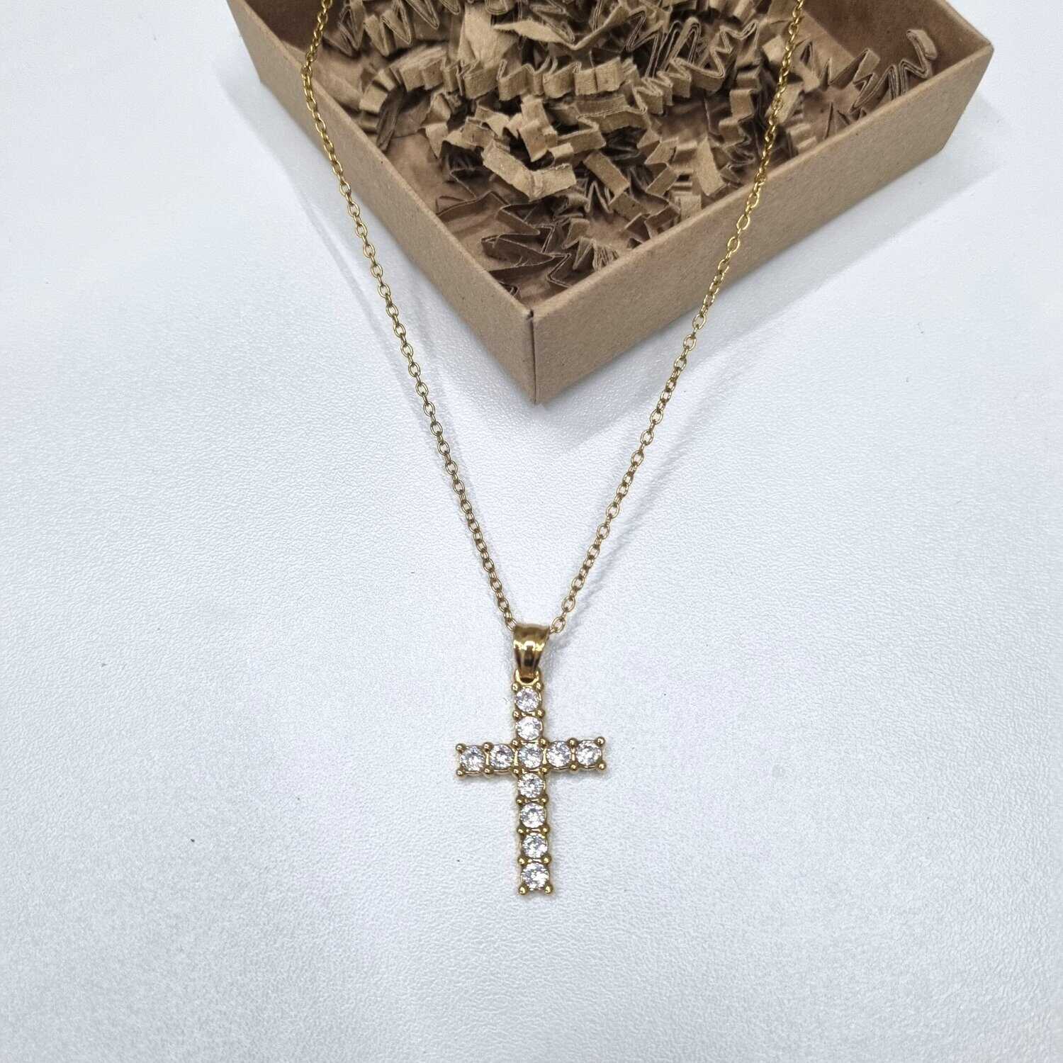Ατσάλινο κολιέ με σταυρό με διάφανα στρας