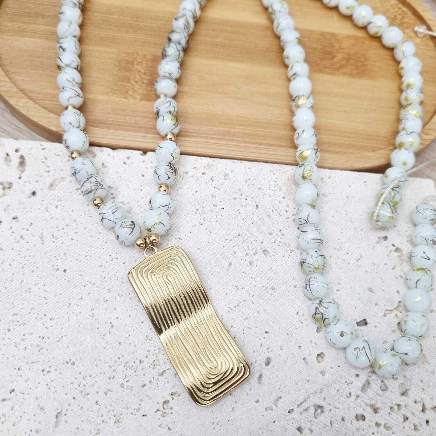 Μακρύ κολιέ με ατσάλινο ανάγλυφο στοιχείο και γυάλινες χάντρες