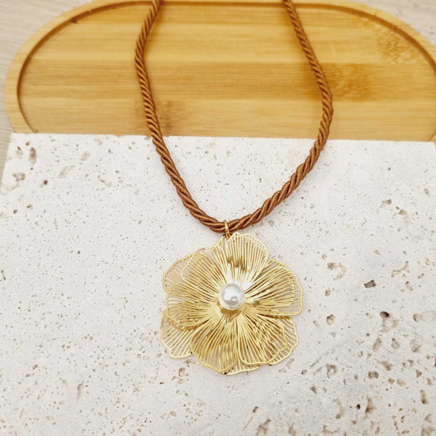 Ατσάλινο κολιέ με λουλούδι με πέρλα σε στριφτό κορδόνι