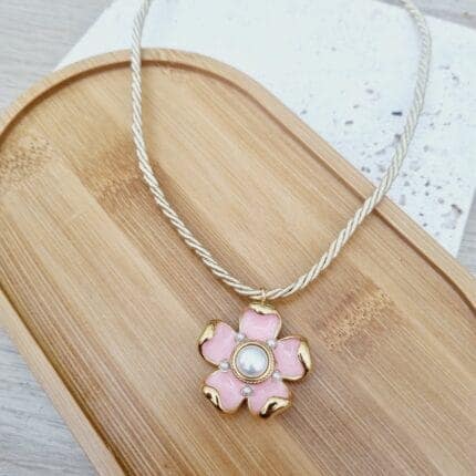 Ατσάλινο κολιέ με λουλούδι με πέρλες σε στριφτό κορδόνι