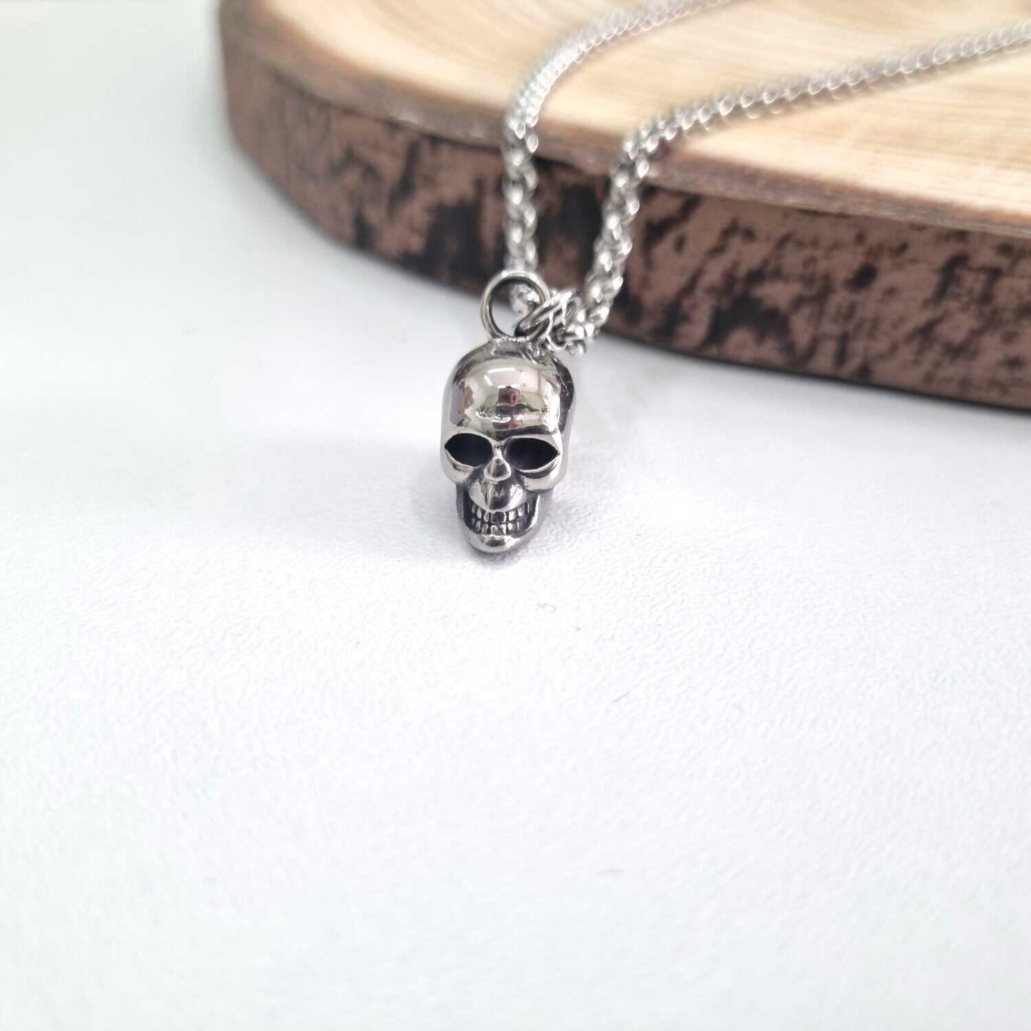 Ατσάλινο κολιέ με αλυσίδα μεγέθους 65cm + 5cm αλυσίδα αυξομείωσης με ατσάλινη ασημί νεκροκεφαλή.