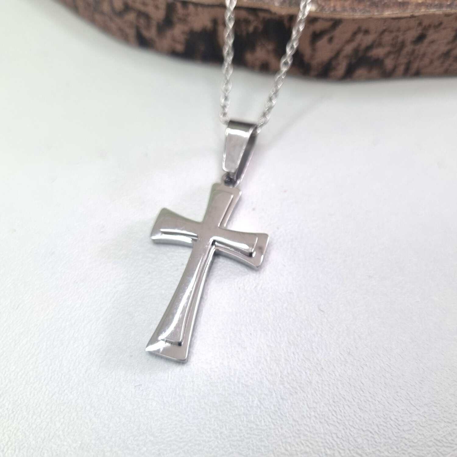 Ατσάλινο κολιέ με αλυσίδα μεγέθους 50cm + 5cm αλυσίδα αυξομείωσης με ατσάλινο ασημί σταυρό.