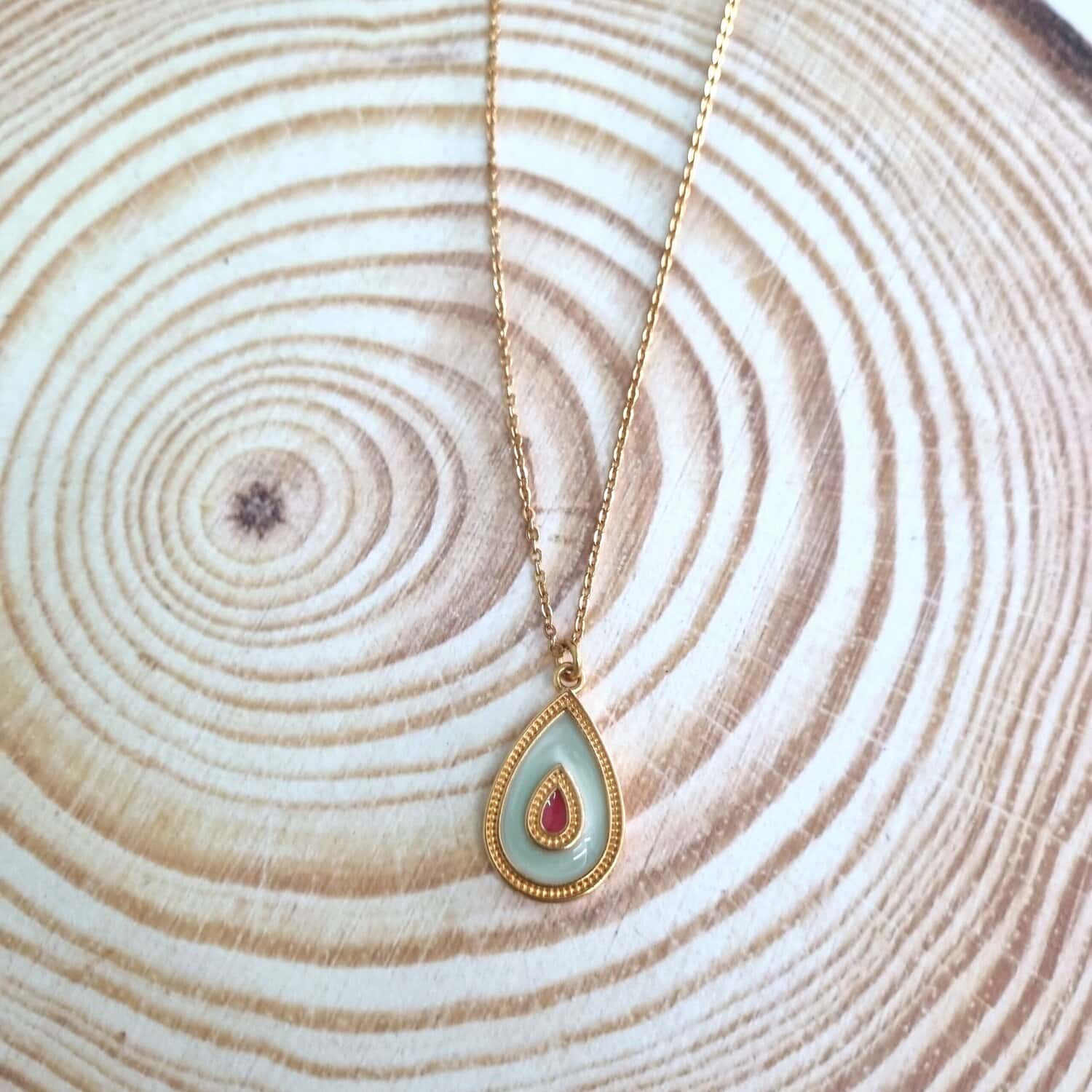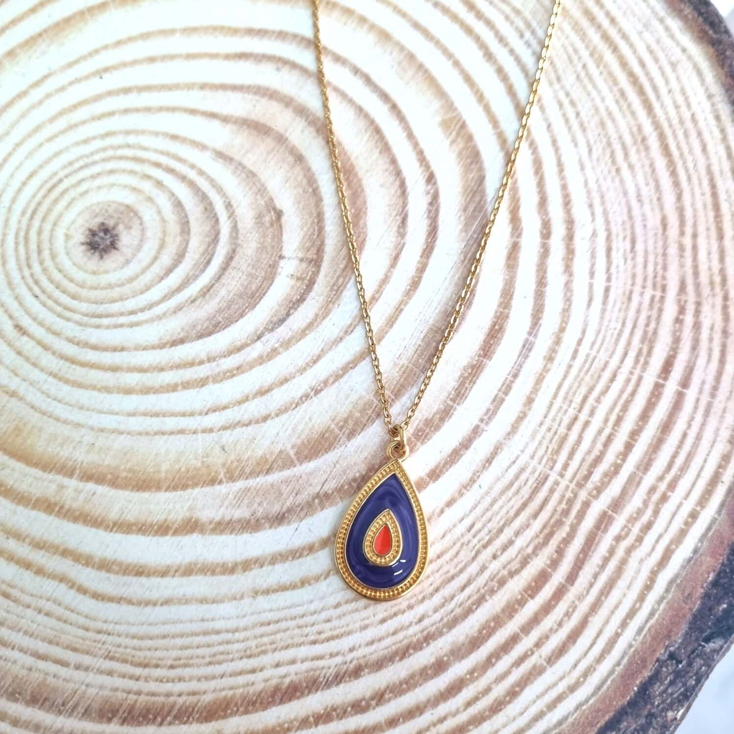 Κολιέ με χρυσή ατσάλινη αλυσίδα και κρεμαστό χρυσό δάκρυ με δίχρωμο σμάλτο από επιχρυσωμένο ορείχαλκο. Το κούμπωμα είναι και αυτό από επιχρυσωμένο ορείχαλκο. Το μέγεθος του κολιέ είναι 45cm + 5cm αλυσίδα αυξομείωσης.