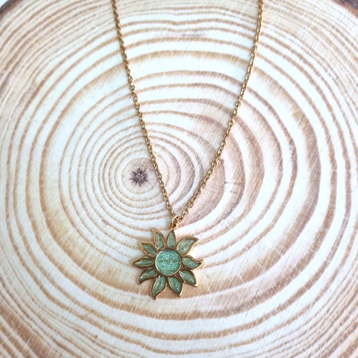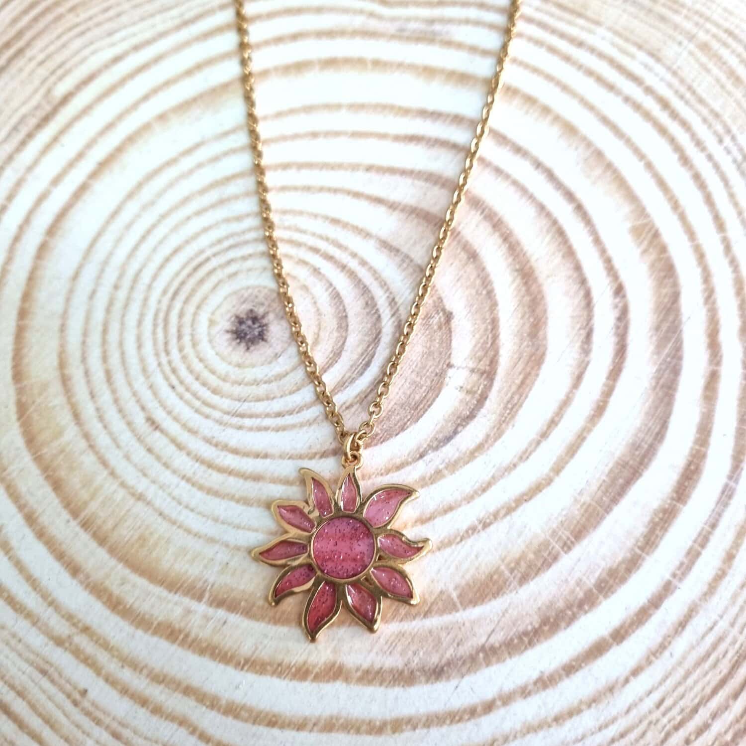 Κολιέ με χρυσή ατσάλινη αλυσίδα και κρεμαστό χρυσό λουλούδι με γκλίτερ από επιχρυσωμένο ορείχαλκο σε τρεις αποχρώσεις, λιλά, φουξ και πράσινο. Το κούμπωμα είναι και αυτό από επιχρυσωμένο ορείχαλκο. Το μέγεθος του κολιέ είναι 45cm + 5cm αλυσίδα αυξομείωσης.