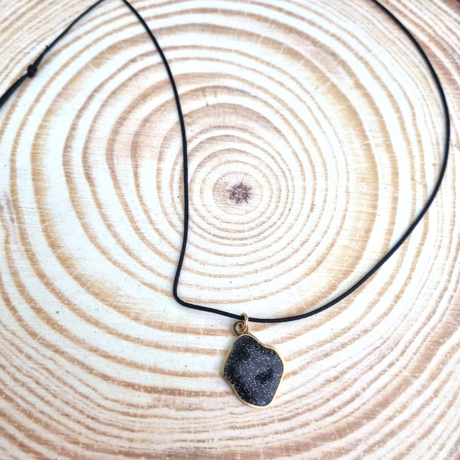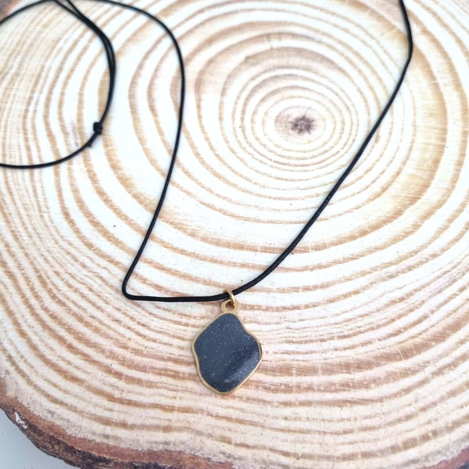 Ατσάλινο μακρύ κολιέ με μαύρο κορδόνι με ρυθμιζόμενο κούμπωμα που μπορεί να φτάσει έως 90cm και ατσάλινο ακανόνιστο στοιχείο με μαύρο, γκρί και άσπρο σμάλτο με γκλίτερ.