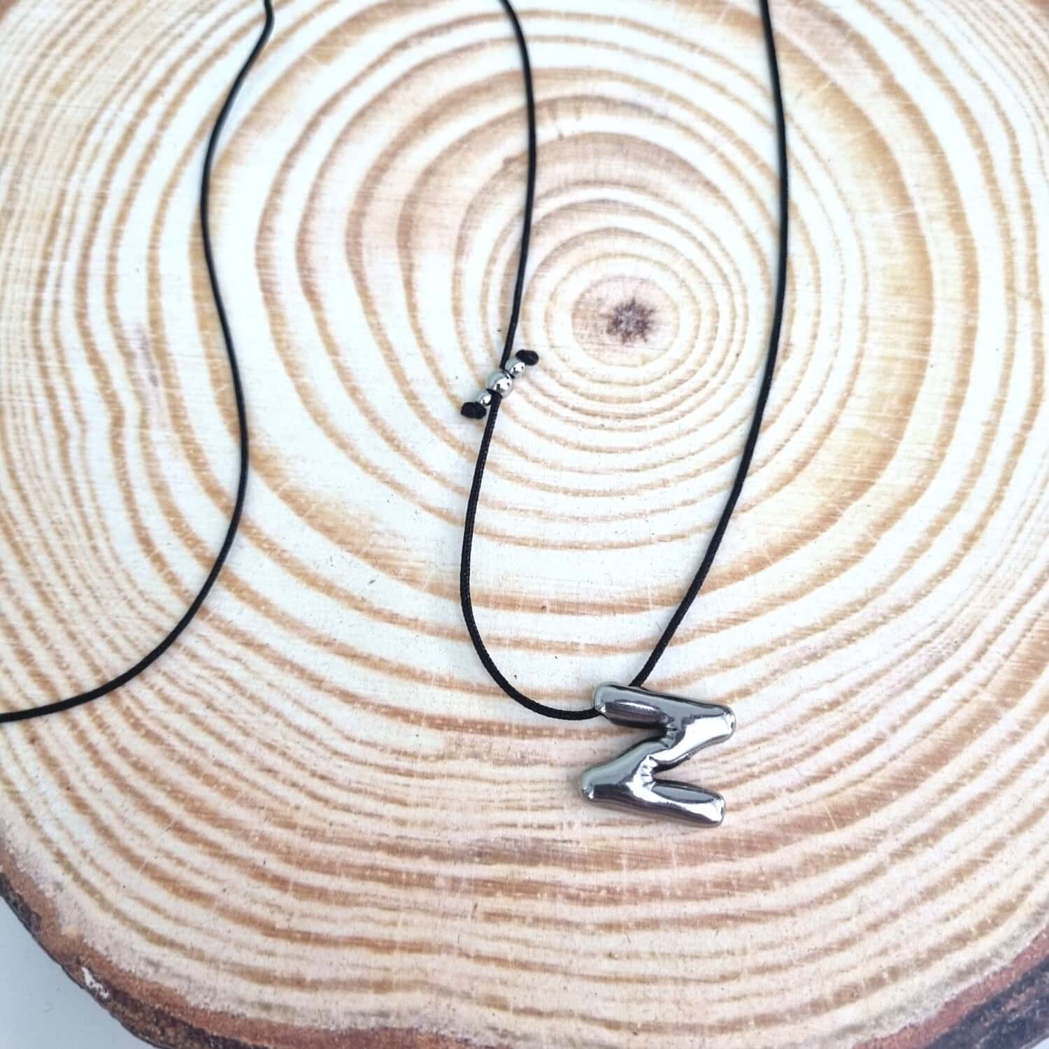 Ατσάλινο μακρύ κολιέ με μαύρο κορδόνι με ρυθμιζόμενο κούμπωμα που μπορεί να φτάσει έως 80cm και ατσάλινο μονόγραμμα.