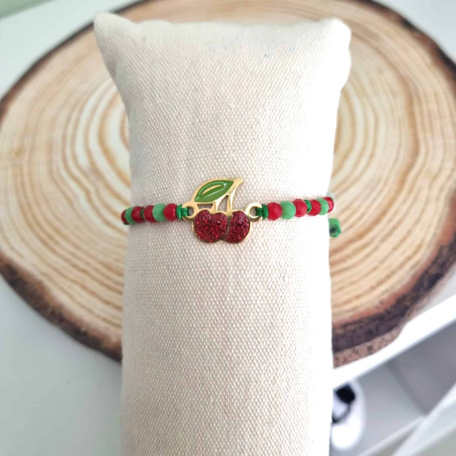 Βραχιόλι με ατσάλινα κερασάκια και χάντρες, σε κορδόνι με μακραμέ δέσιμο. Έχει ρυθμιζόμενο μέγεθος.
