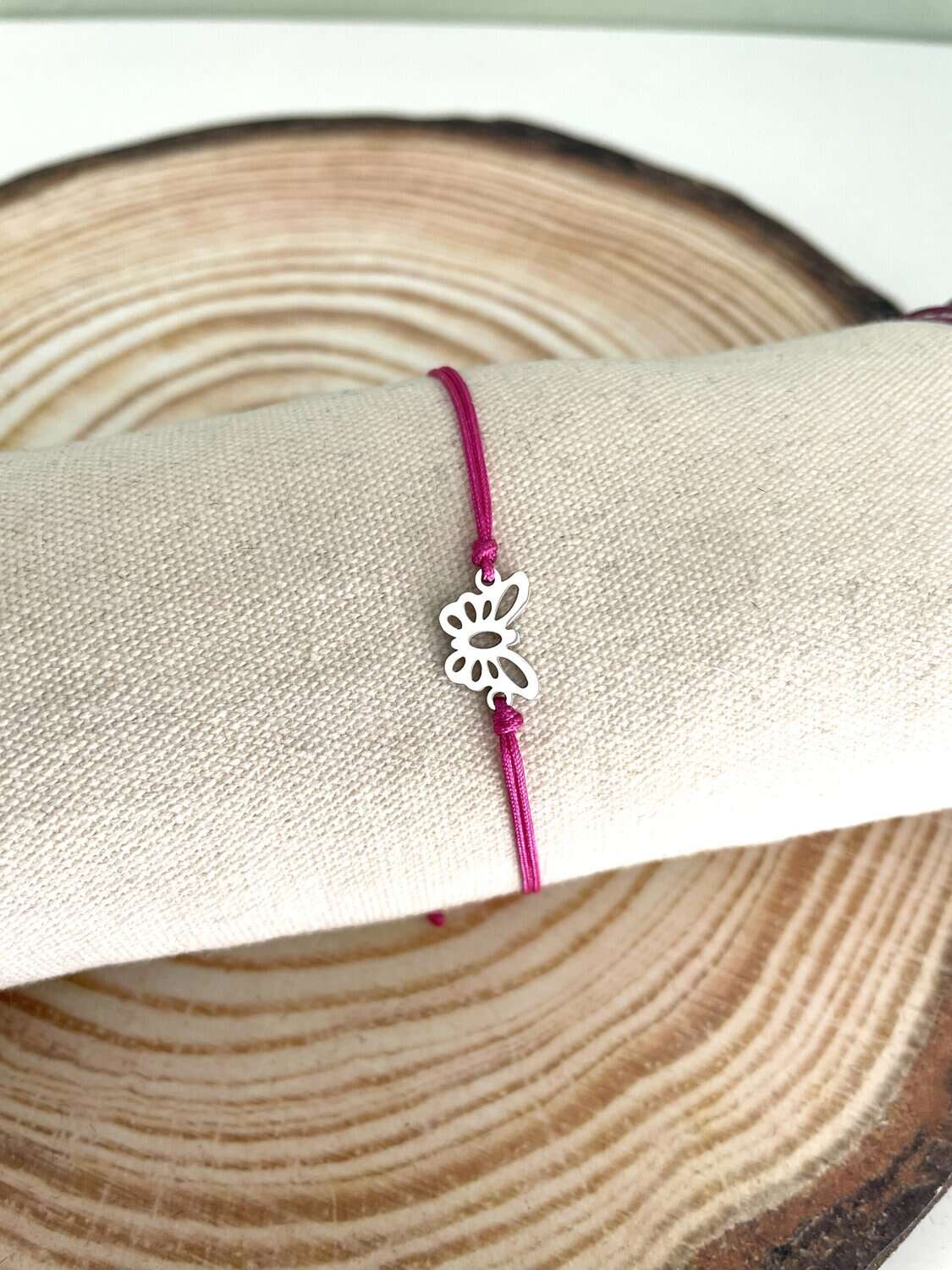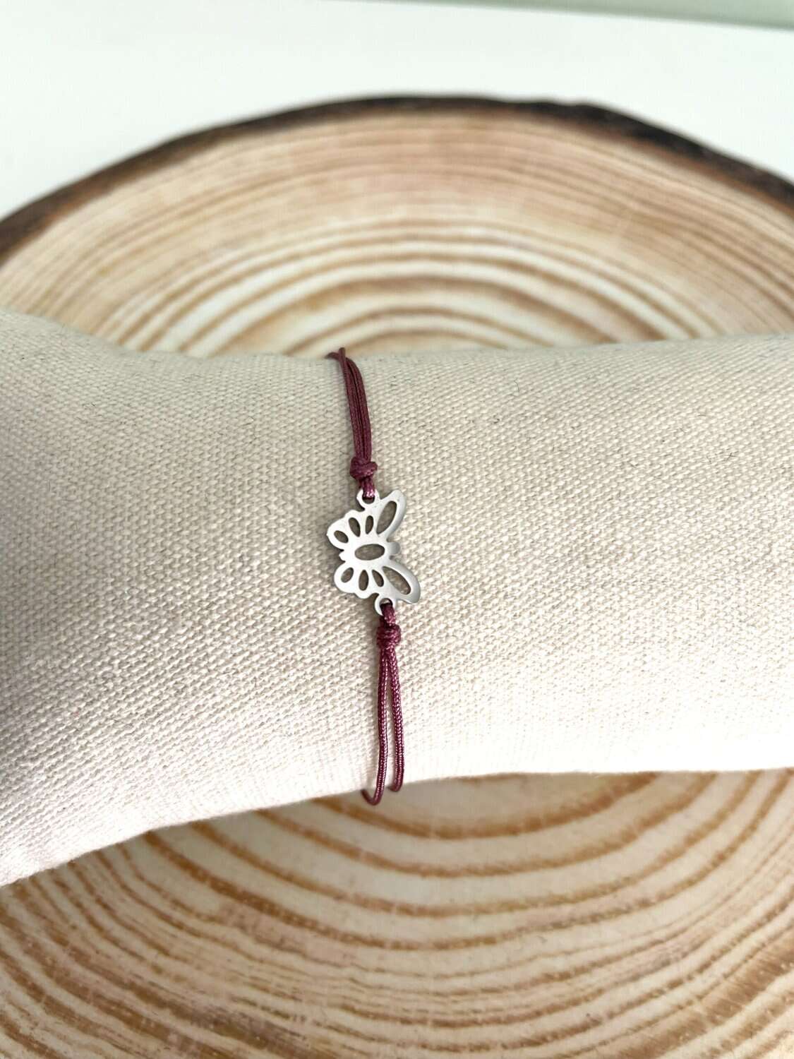 Βραχιόλι με ατσάλινη πεταλούδα, σε κορδόνι με μακραμέ δέσιμο. Έχει ρυθμιζόμενο μέγεθος.