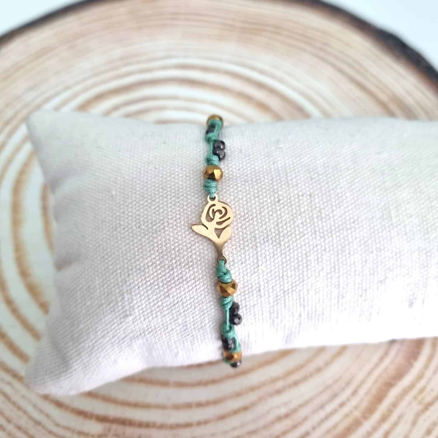 Βραχιόλι με ατσάλινο τριανταφυλλάκι και χάντρες, σε κορδόνι με μακραμέ δέσιμο. Έχει ρυθμιζόμενο μέγεθος.