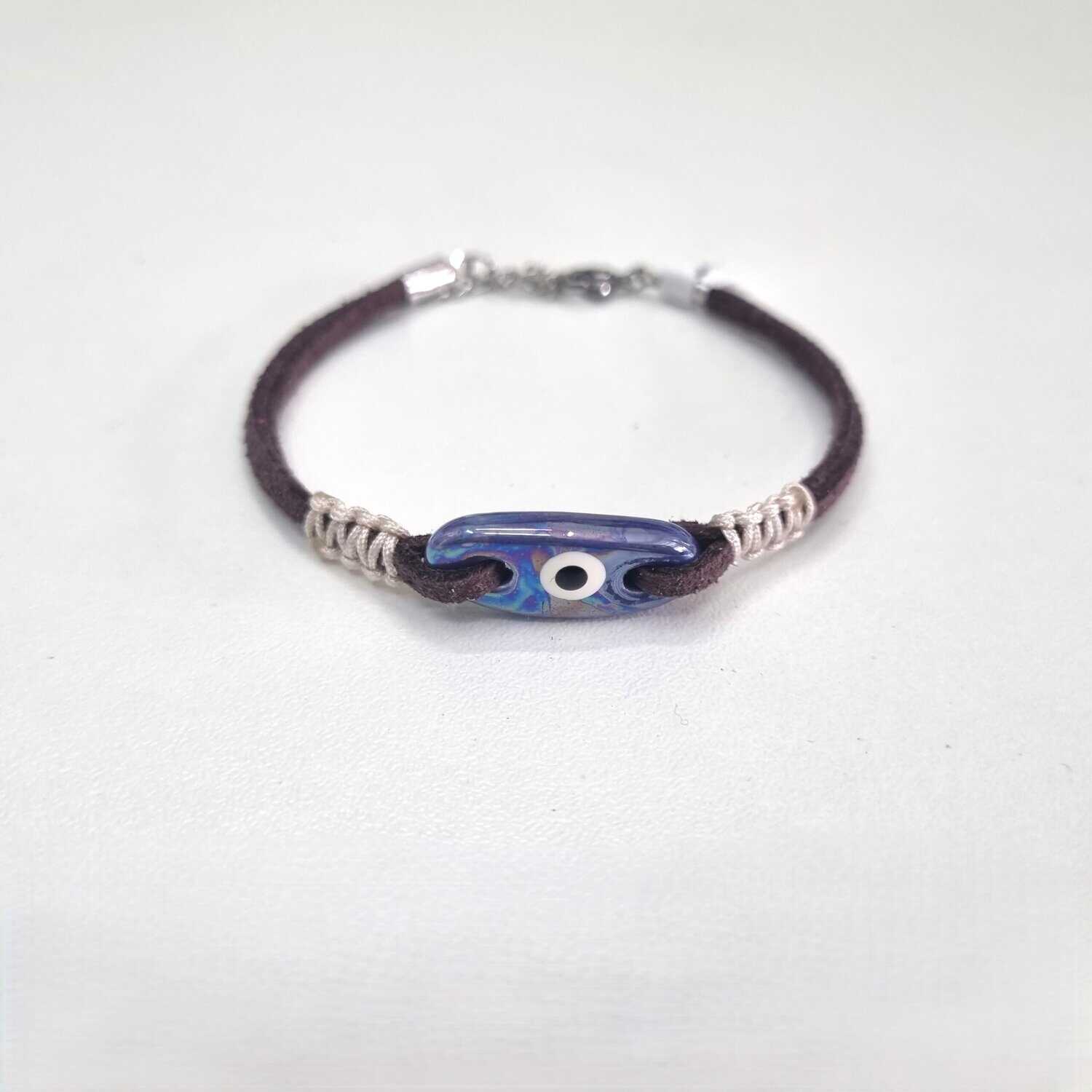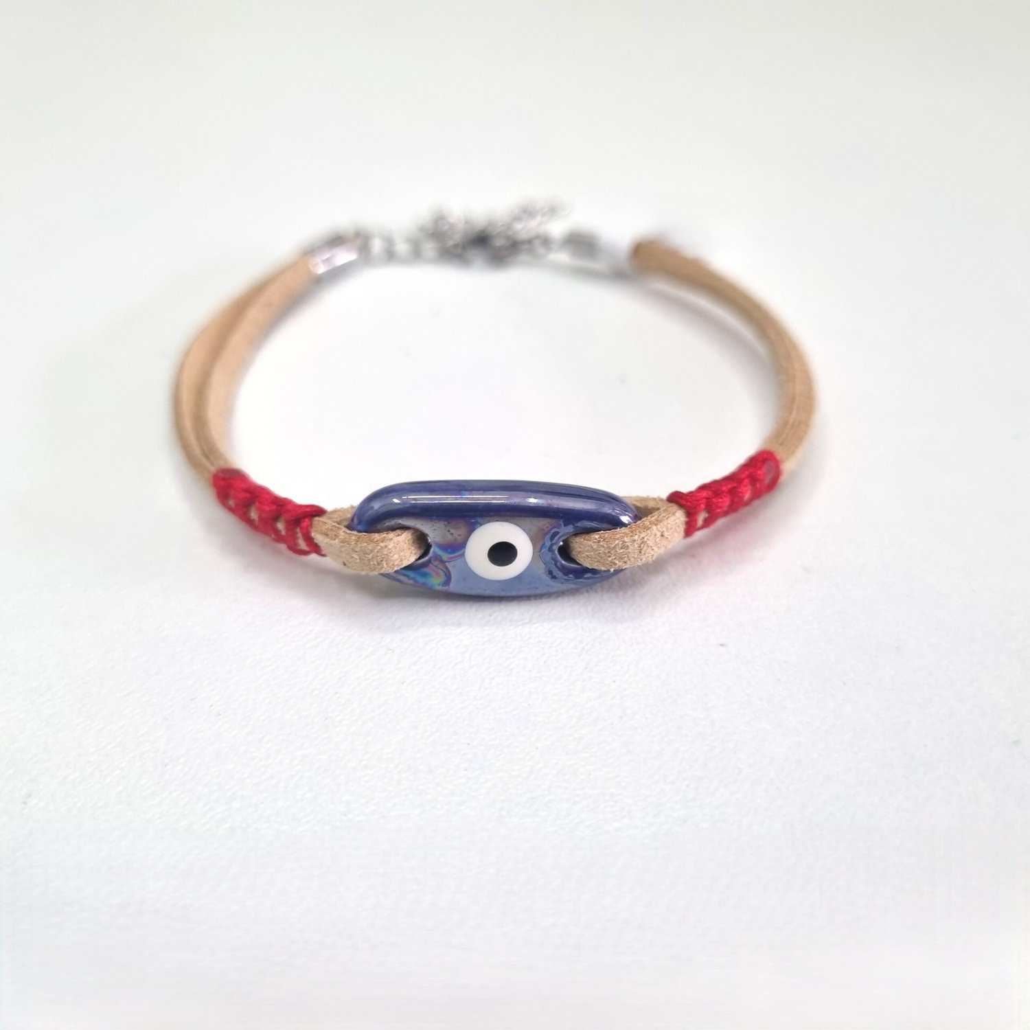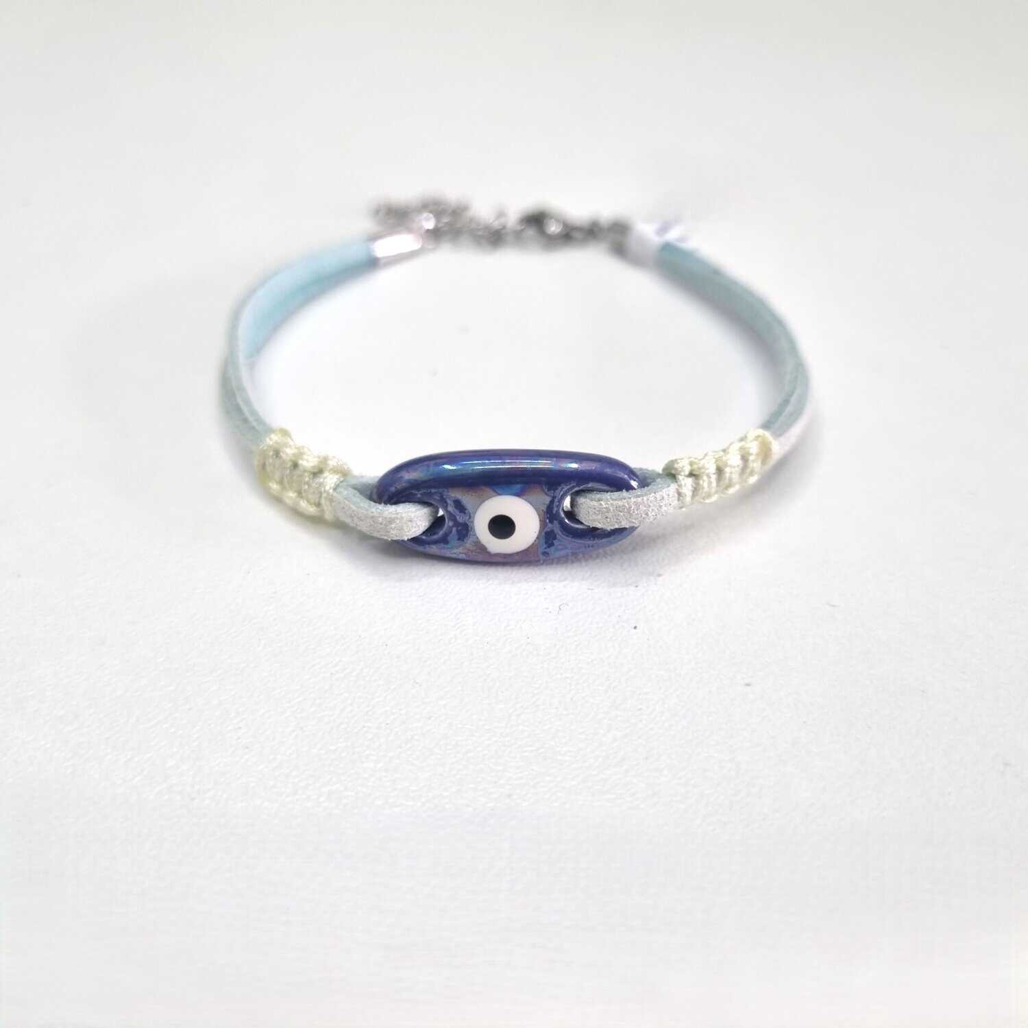 Βραχιόλι με μπλε κεραμικό μάτι με καστορ κορδόνι. Όλα τα μεταλλικά στοιχεία είναι από ατσάλι.