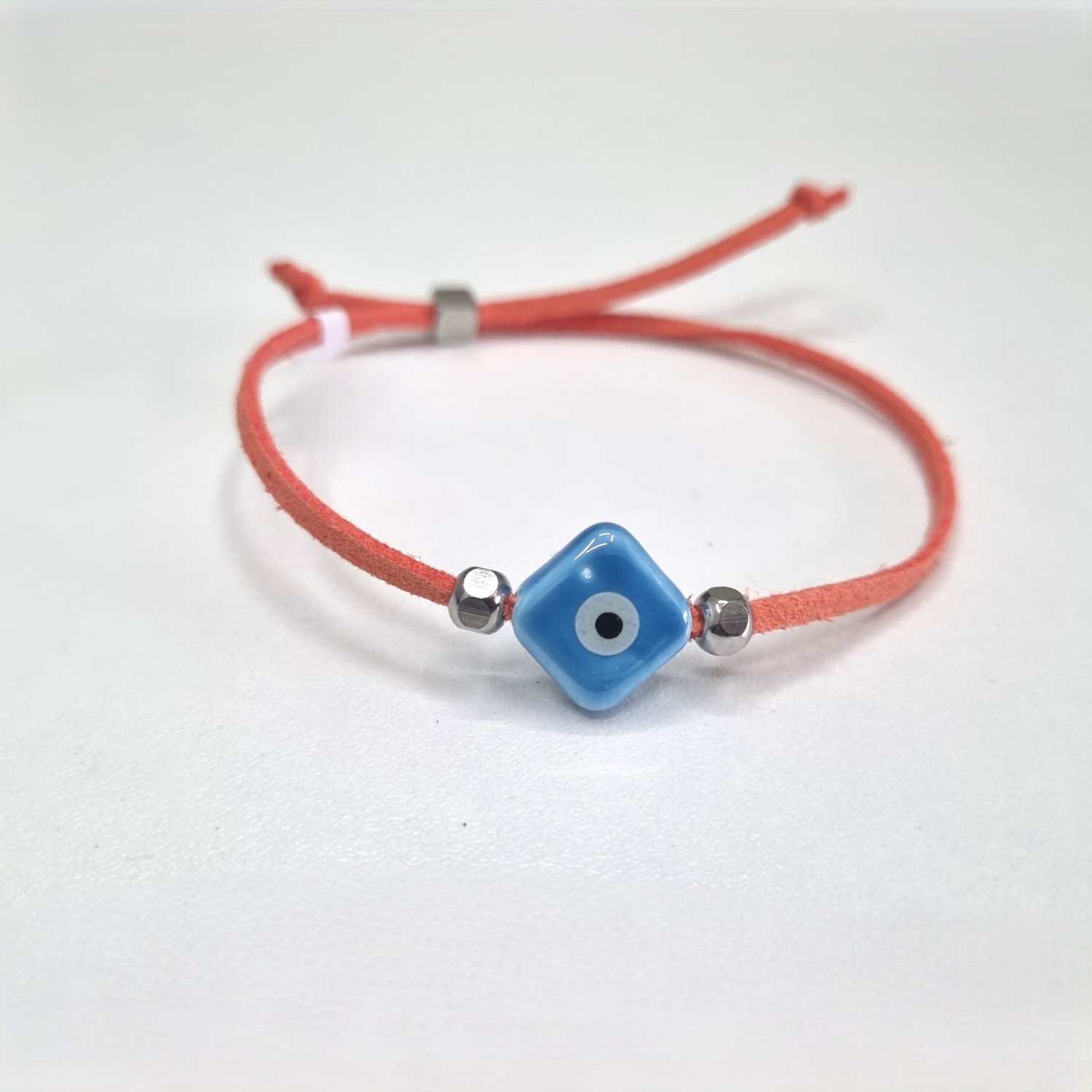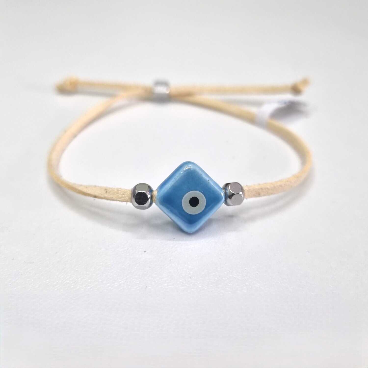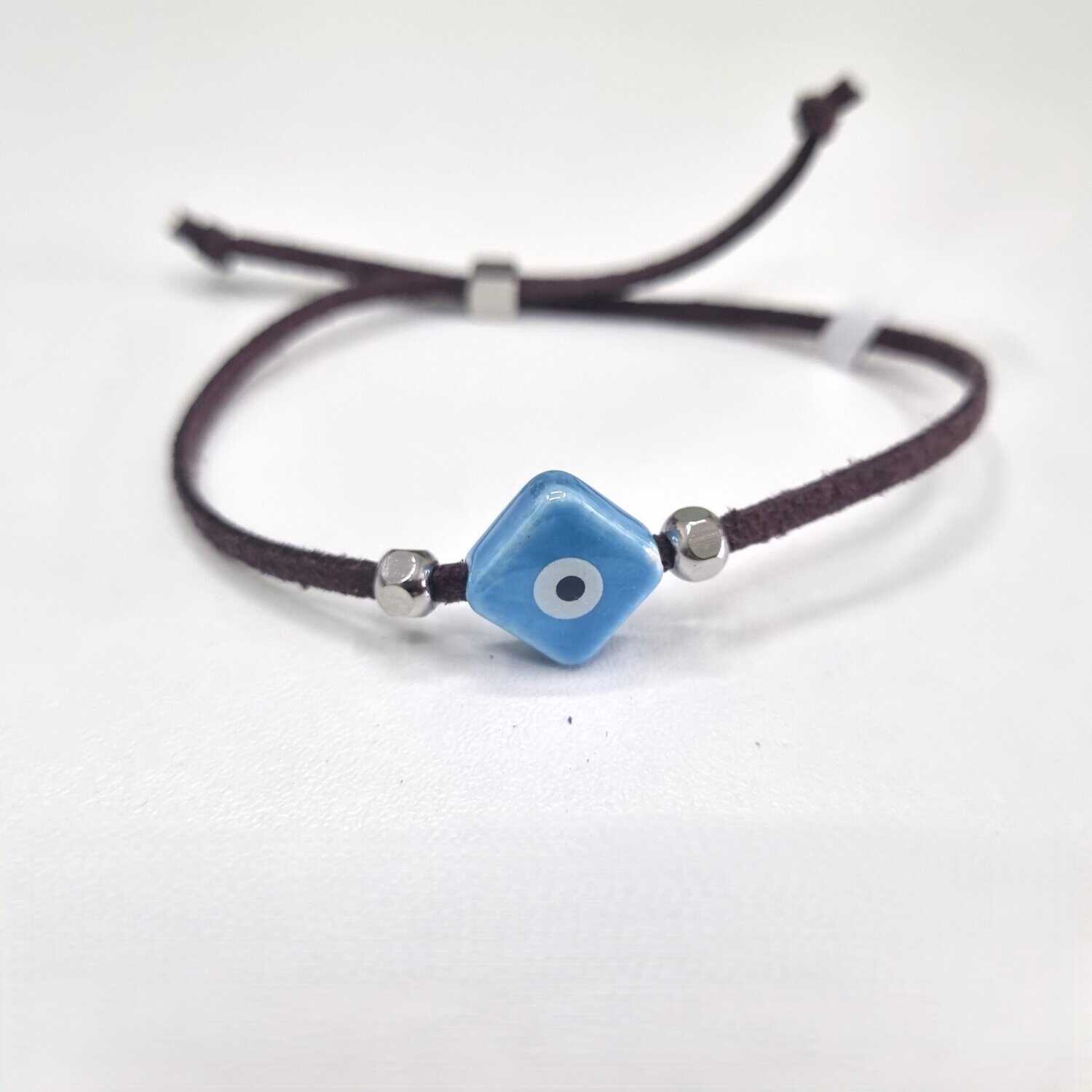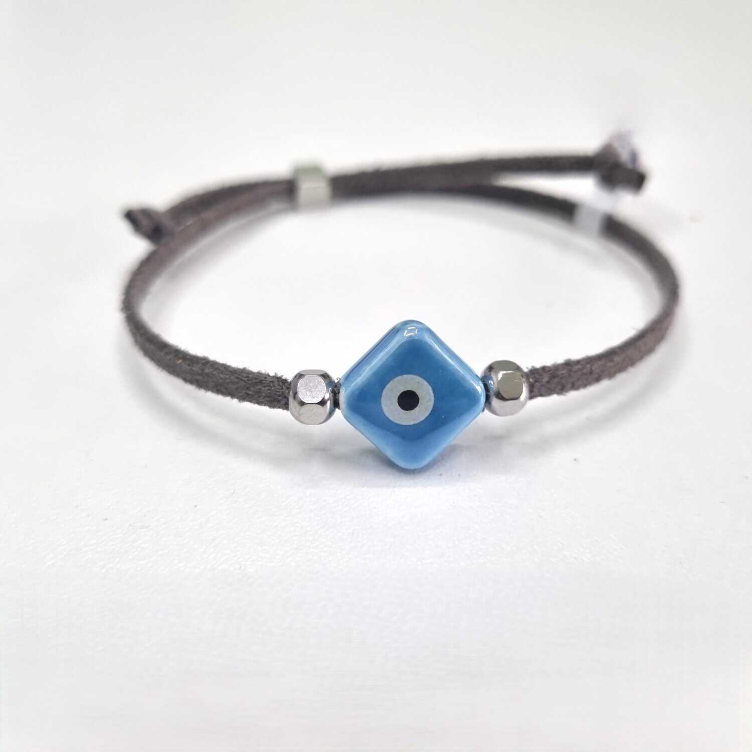 Βραχιόλι με γαλάζιο κεραμικό μάτι με καστορ κορδόνι, ατσάλινες χάντρες και κούμπωμα με αυξομείωση.